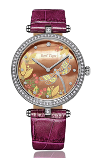 棕色 MOP 表盤,帶蜻蜓和花朵圖案。鉆石標(biāo)記,小時和分鐘顯示。這款時尚的女士腕表表盤上有花朵圖案,12 點鐘位置有一顆鉆石。