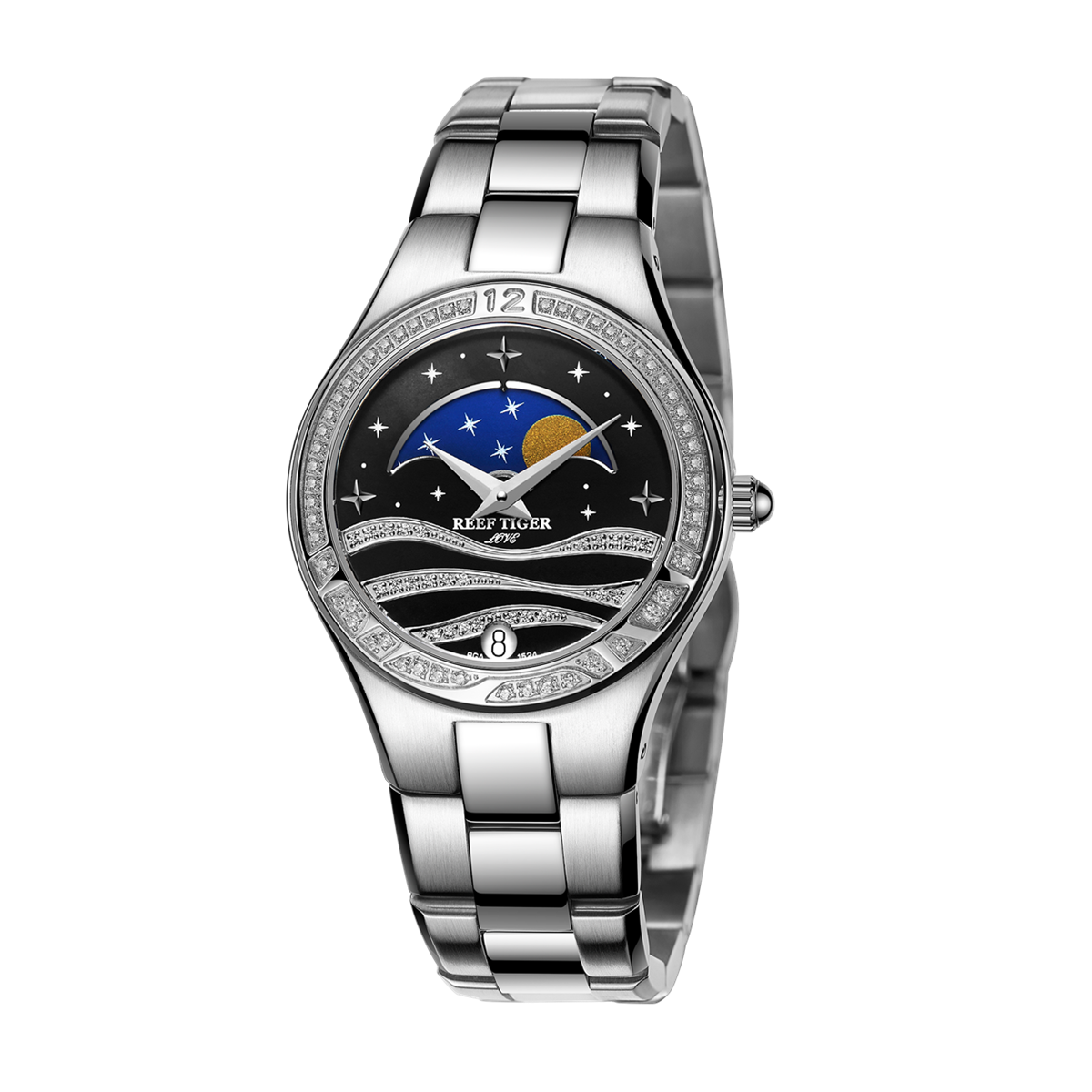 這款腕表的表殼采用不銹鋼材質(zhì),表殼尺寸為30*8mm,延續(xù)了瑞夫泰格Love Stars系列腕表的簡(jiǎn)潔線條。月相的設(shè)計(jì)獨(dú)特而和諧。其弧度符合人體工程學(xué)設(shè)計(jì),確保佩戴舒適。