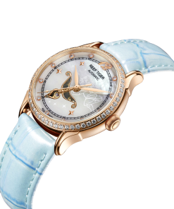 白色 MOP 表盤,帶鉆石標(biāo)記。顯示小時(shí)、分鐘、秒。這款奢華腕表的表盤 12 點(diǎn)鐘位置印有品牌標(biāo)識(shí)。