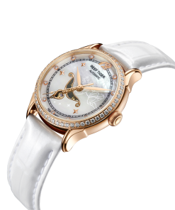 白色 MOP 表盤,帶鉆石標(biāo)記。時、分、秒顯示。這款奢華腕表的表盤 12 點(diǎn)鐘位置印有其標(biāo)志。