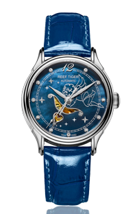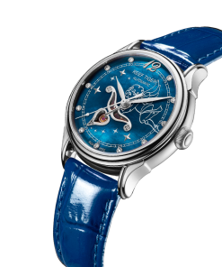 藍色 MOP 表盤,帶鉆石時標。顯示時、分、秒。這款奢華腕表的表盤 12 點鐘位置印有品牌標識。