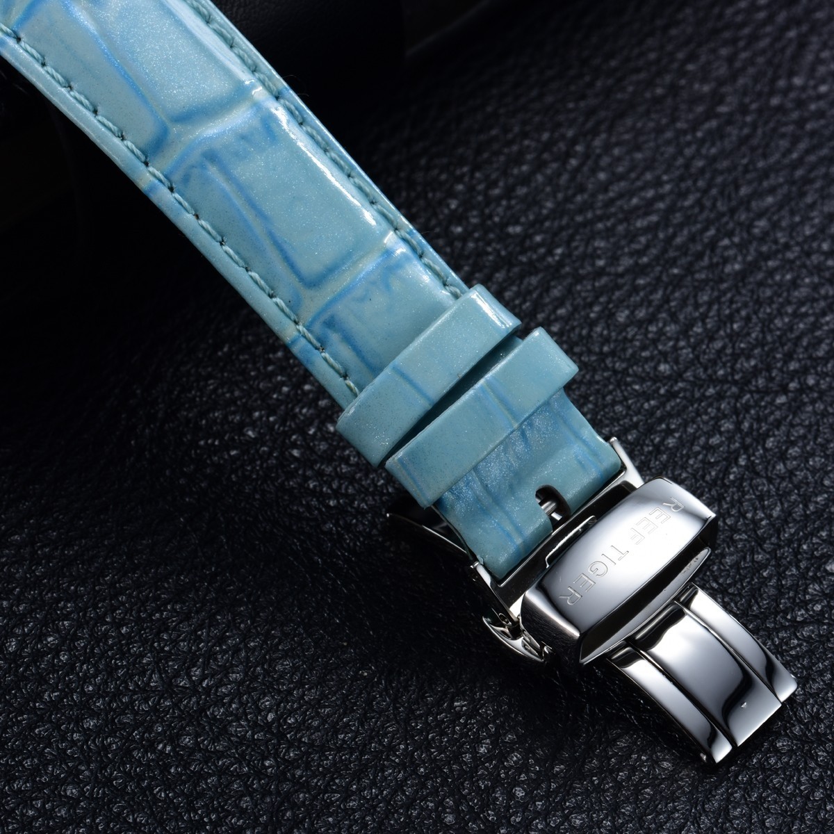 藍色漆皮表帶,配有折疊扣。