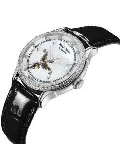 白色 MOP 表盤(pán),帶鉆石標(biāo)記。時(shí)、分、秒顯示。這款奢華腕表的表盤(pán) 12 點(diǎn)鐘位置印有其標(biāo)志。