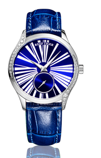 藍(lán)色表盤,帶羅馬數(shù)字鉆石標(biāo)記。顯示小時、分鐘和秒。這款奢華腕表的表盤 12 點鐘位置印有品牌標(biāo)識。