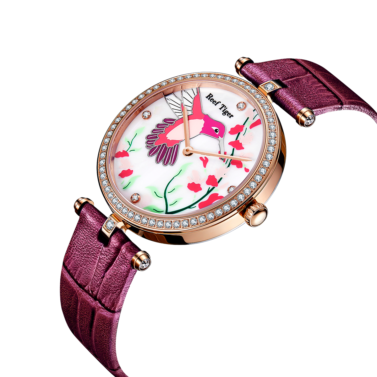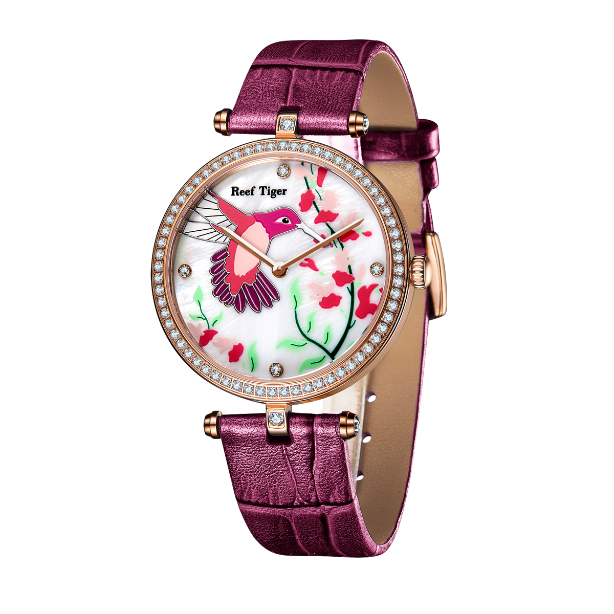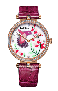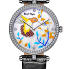 白色 MOP 表盤,帶鳥和花圖案。鉆石標記,小時和分鐘顯示。這款時尚的女士手表表盤上有花朵圖案,10 點鐘位置有一只小鳥。
