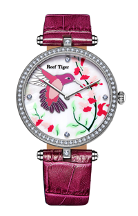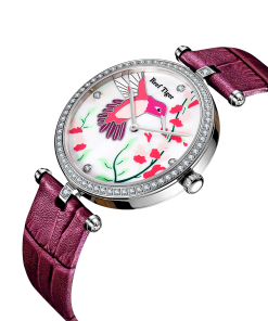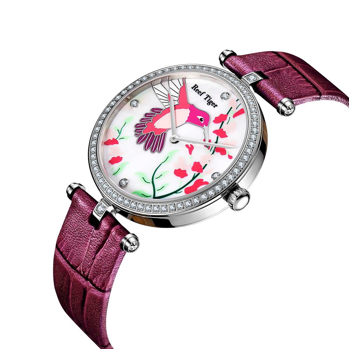 白色 MOP 表盤,帶有鳥和花圖案。鉆石標(biāo)記,小時(shí)和分鐘顯示。這款時(shí)尚的女士手表表盤上有花朵圖案。