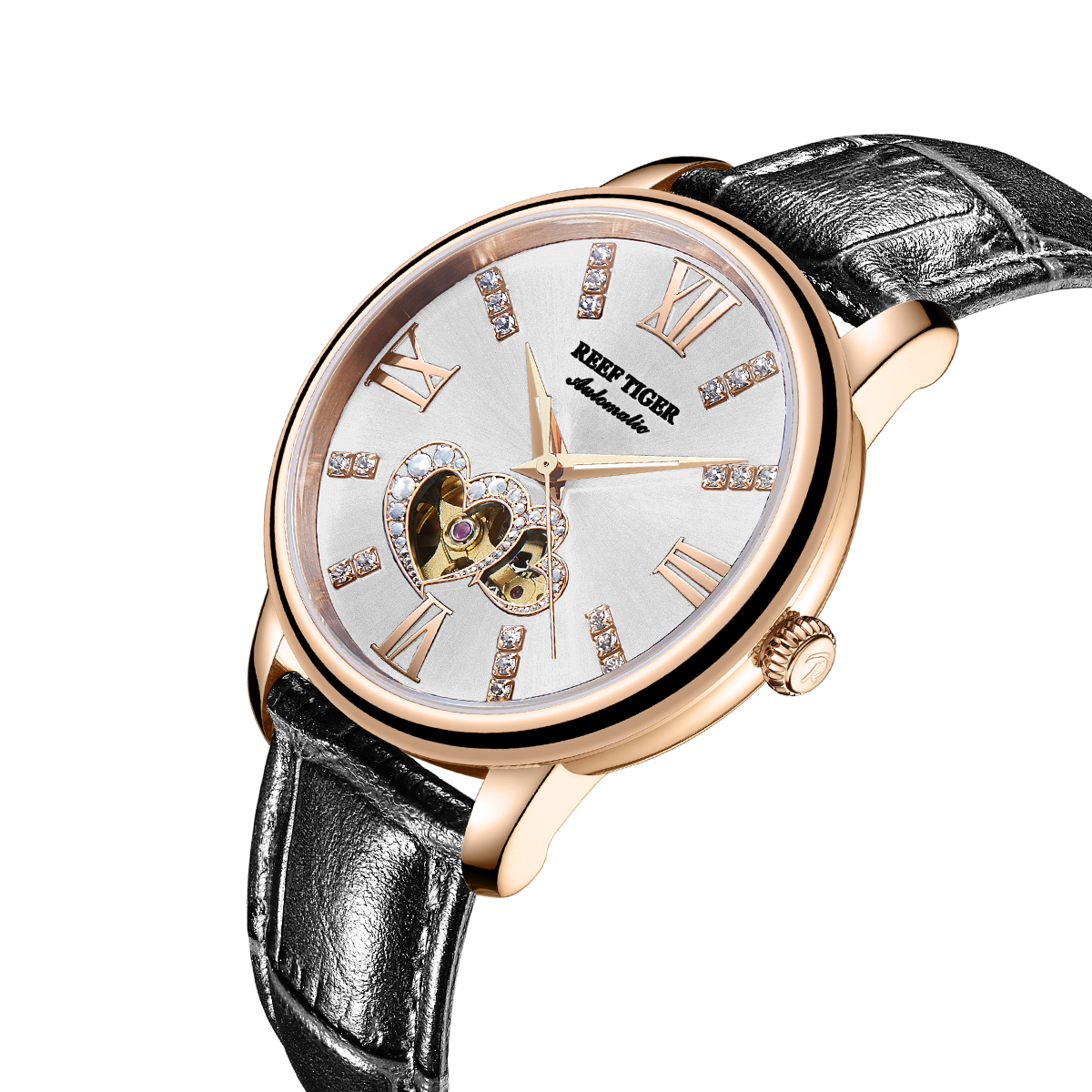 Reef Tiger Love Watch。耐用的玫瑰金表圈,還配有玫瑰金表圈,打造專業(yè)的提案和演示。耐用的聚酯前后蓋,協(xié)調(diào)一致。