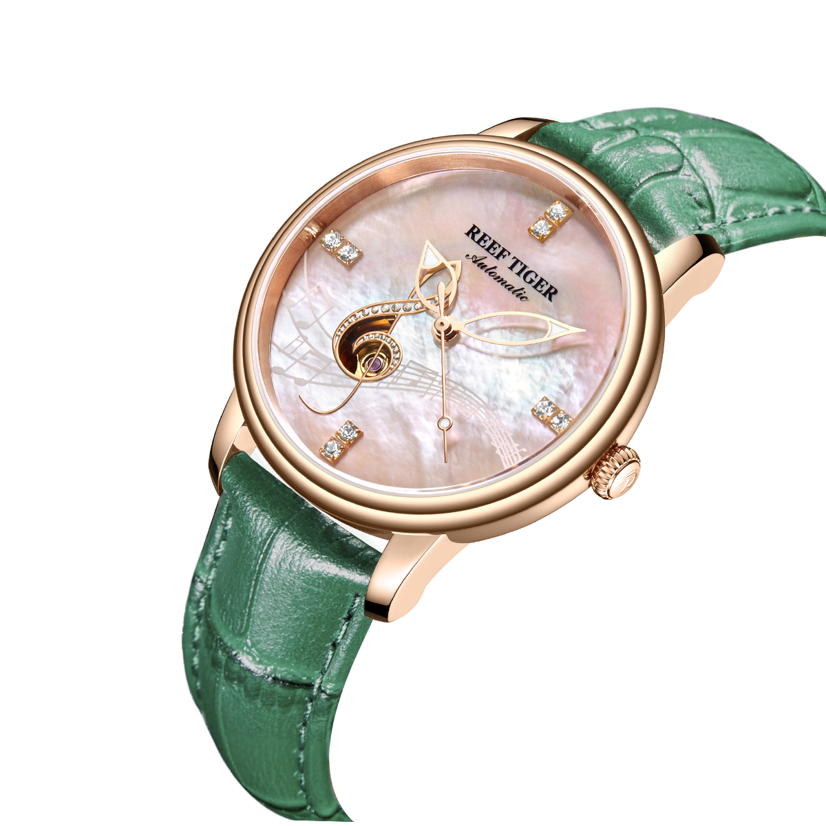 Reef Tiger Love Melody 腕表。耐用的玫瑰金表圈,還配有玫瑰金表圈,打造專(zhuān)業(yè)的提案和演示。耐用的聚酯前后蓋,協(xié)調(diào)一致。