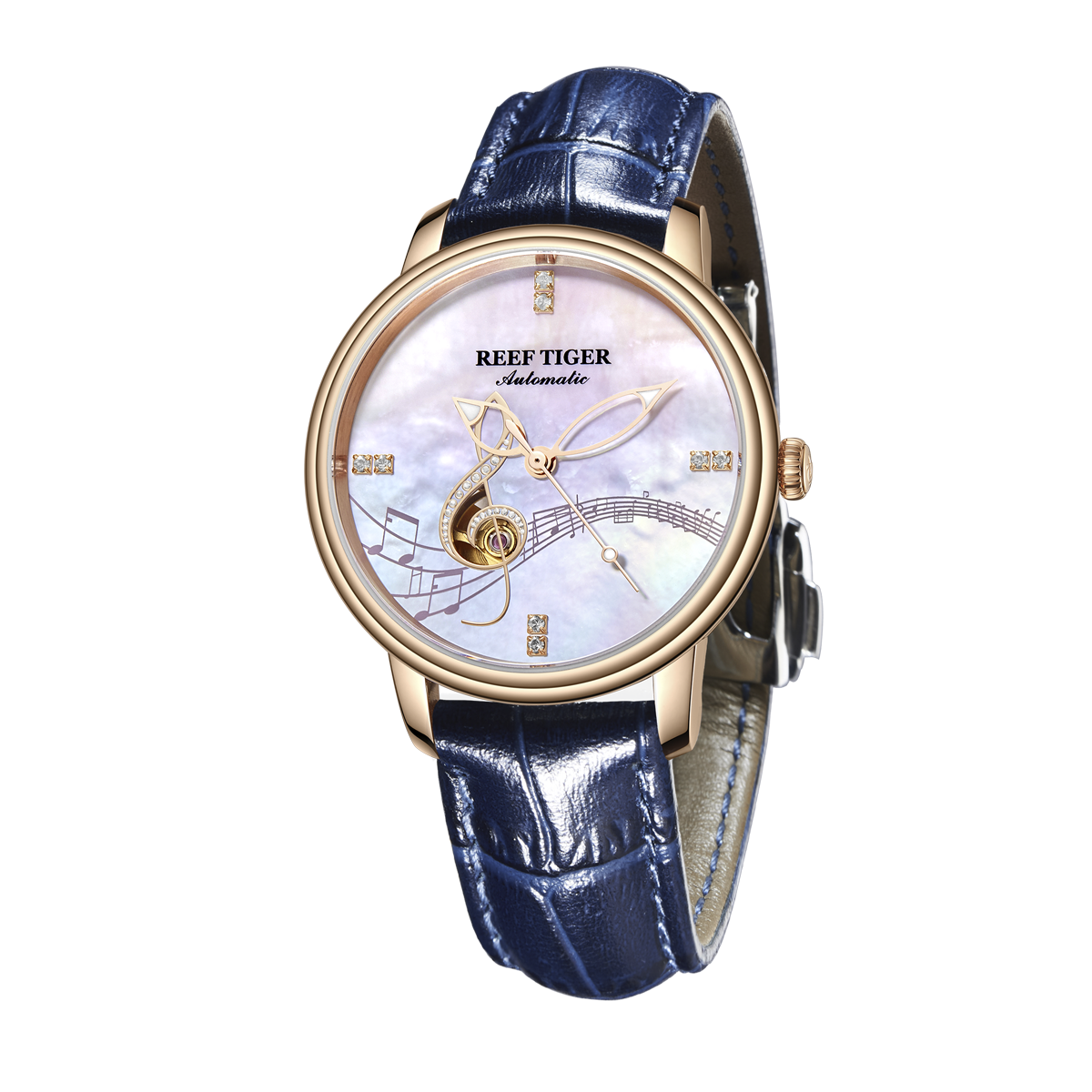 Reef Tiger Love Melody 腕表。耐用的玫瑰金表圈,還配有玫瑰金表圈,打造專業(yè)的提案和演示。耐用的聚酯前后蓋,協(xié)調(diào)一致。