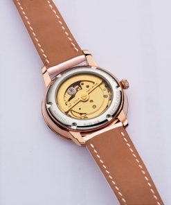 粉色表盤,帶旋律圖案標(biāo)記。時(shí)、分、秒顯示。這款奢華腕表的標(biāo)志位于 12 點(diǎn)鐘位置。