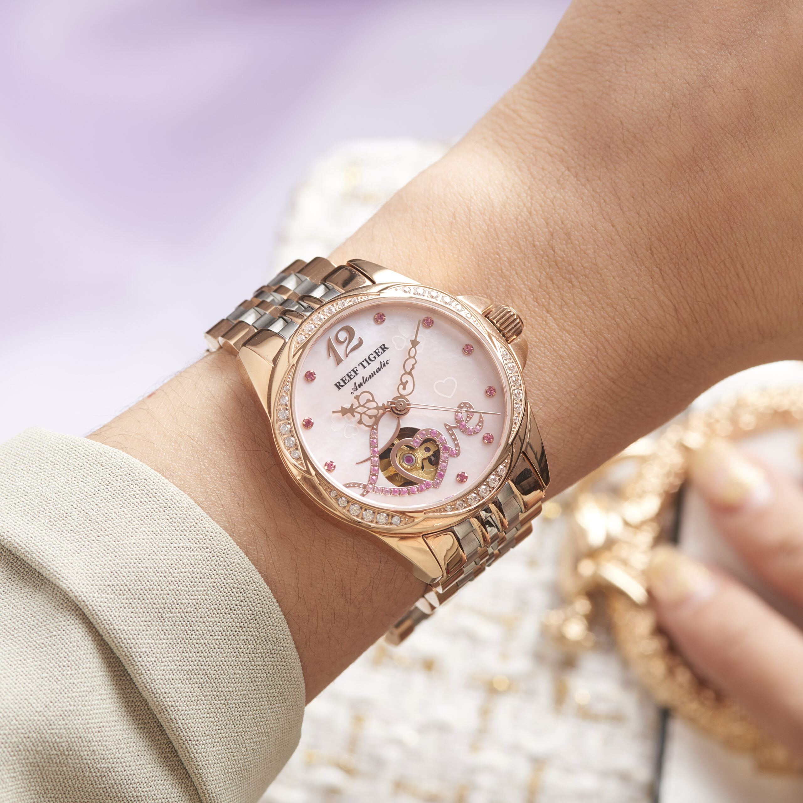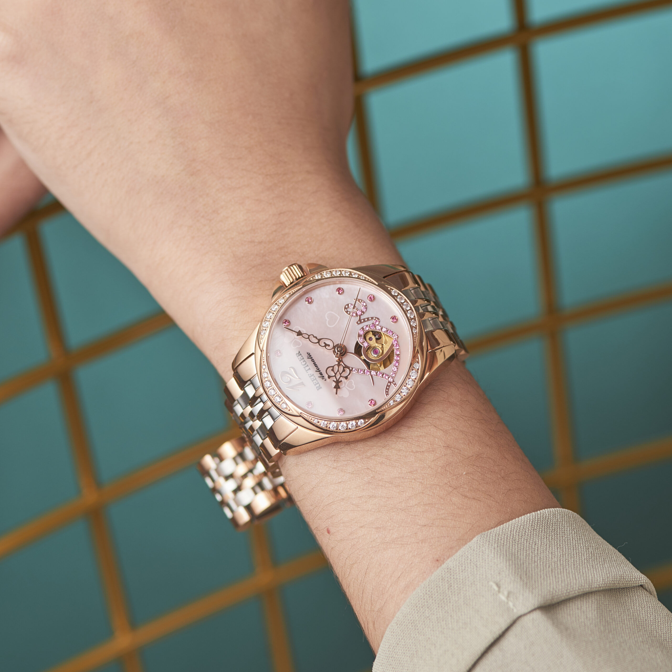 Love Double Heart 女士腕表。耐用的不銹鋼鉆石表圈還配有鉆石,打造專業(yè)的求婚和演示。耐用的聚酯前后蓋與表盤(pán)相得益彰。