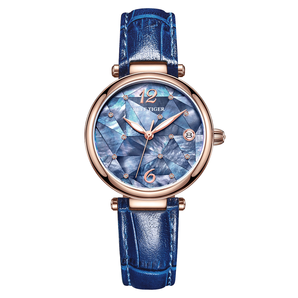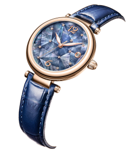 藍(lán)色 MOP 表盤,帶鉆石標(biāo)記。顯示小時(shí)、分鐘、秒。這款奢華腕表的表盤 12 點(diǎn)鐘位置印有品牌標(biāo)識(shí)。