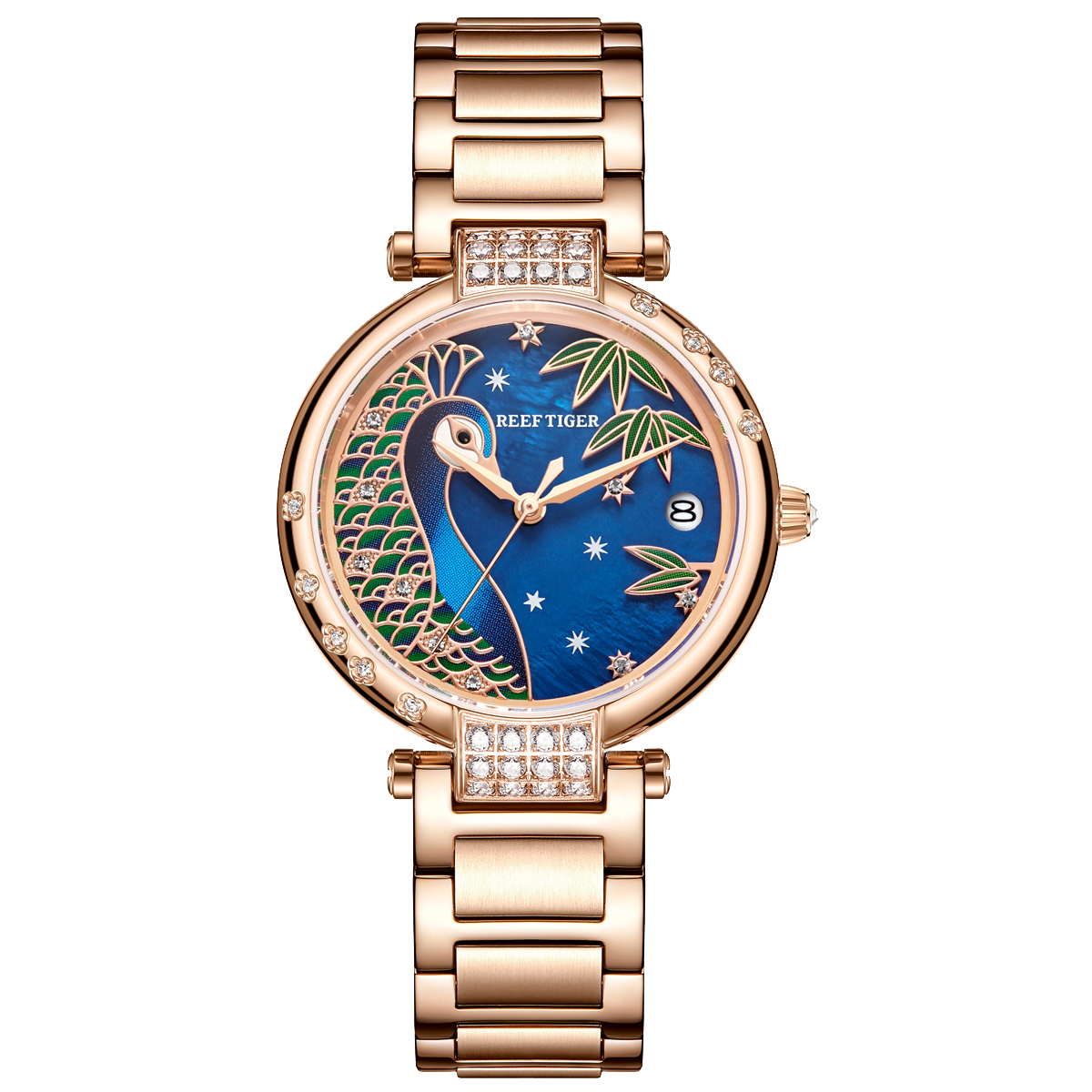 Reef Tiger Love Peacock 腕表。耐用的鋼質(zhì)表圈還配有專業(yè)級的提案和演示。耐用的聚酯前后蓋與表盤相得益彰。
