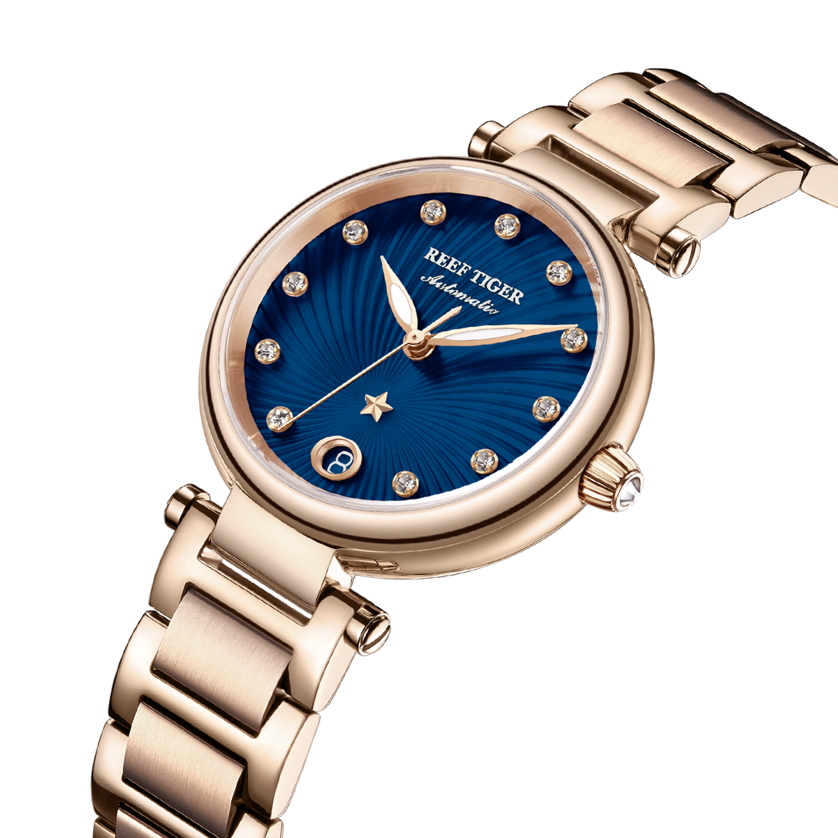 Reef Tiger Love Polaris 腕表。耐用的玫瑰金表圈,還配有玫瑰金表圈,打造專業(yè)的提案和演示。耐用的聚酯前后蓋,協(xié)調(diào)一致。