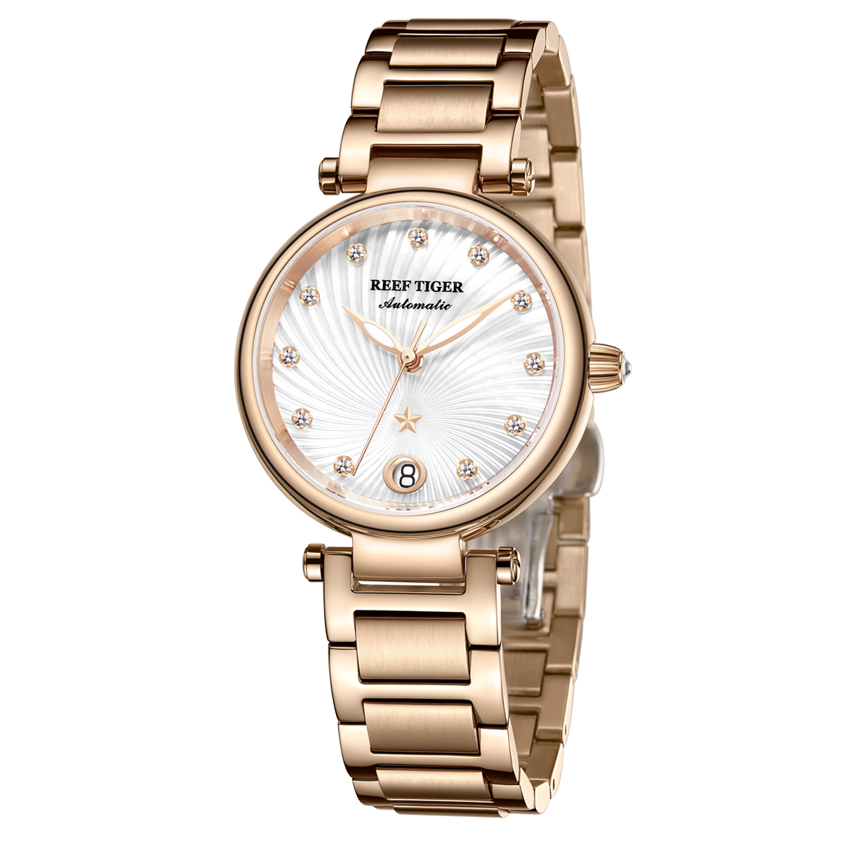 Reef Tiger Love Polaris 腕表。耐用的玫瑰金表圈,還配有玫瑰金表圈,打造專業(yè)的提案和演示。耐用的聚酯前后蓋,協(xié)調一致。