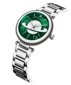 綠色表盤,帶棒狀標(biāo)記。時(shí)、分、秒和日期顯示。這款奢華腕表的表盤 12 點(diǎn)鐘位置印有品牌標(biāo)識。