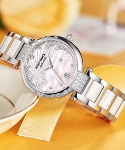 粉色表盤,鉆石圓點(diǎn)標(biāo)記。時(shí)、分、秒和日期顯示。這款奢華腕表的表盤 12 點(diǎn)鐘位置印有品牌標(biāo)識(shí)。