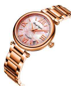 粉色表盤,帶羅馬時標。時、分、秒和日期顯示。這款奢華腕表的表盤 12 點鐘位置印有品牌標識。