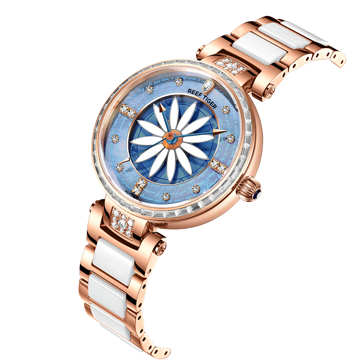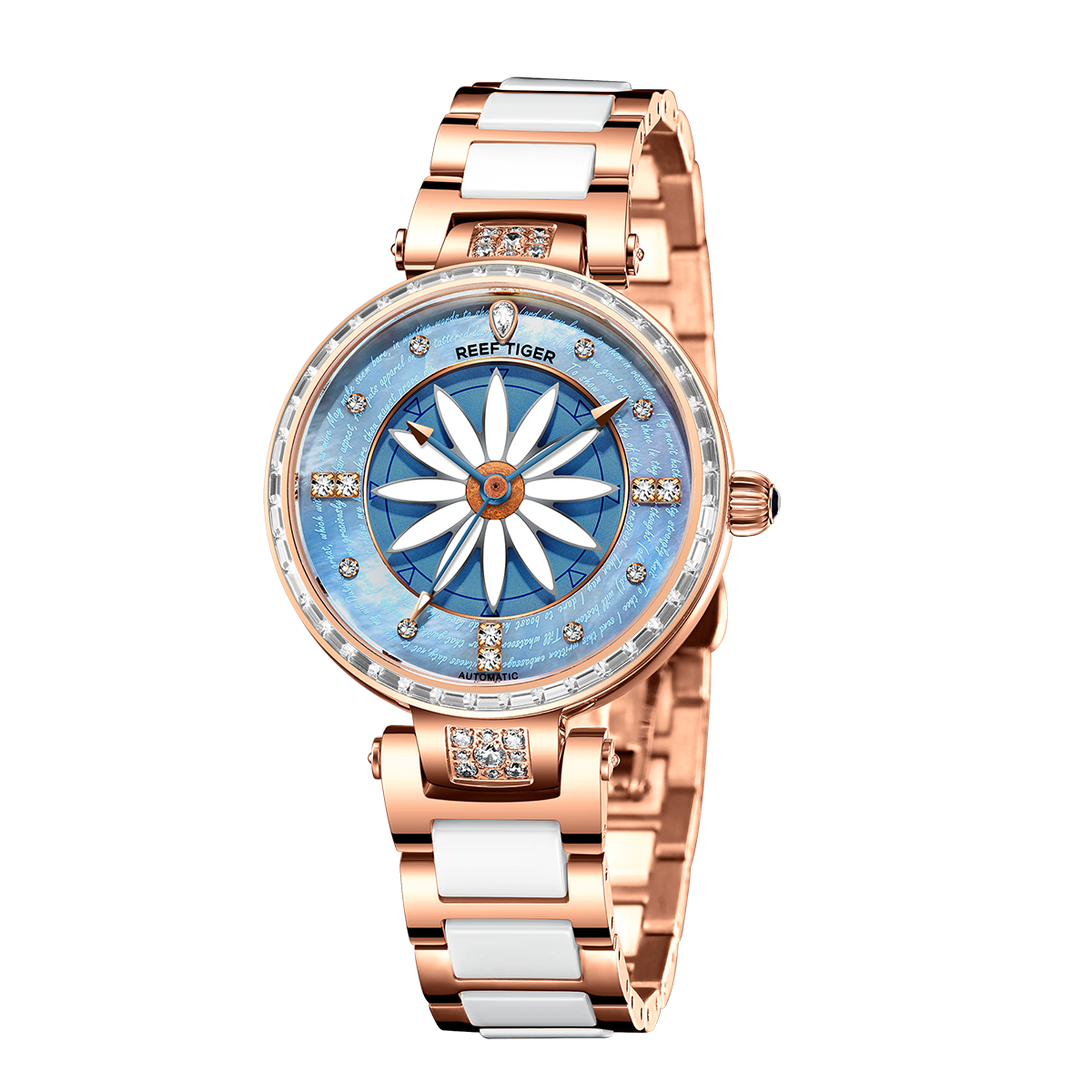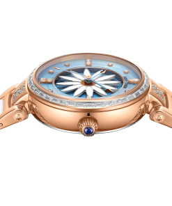 表盤(pán)配有鉆石標(biāo)記。顯示時(shí)、分、秒。手表表盤(pán)中央有一朵美麗的百合花。