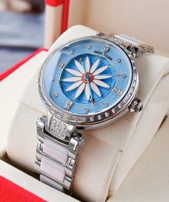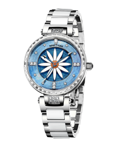 表盤配有鉆石標記。顯示時、分、秒。手表表盤中央有一朵美麗的百合花。