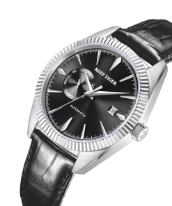 黑色表盤,帶棒狀標(biāo)記。時(shí)、分、秒和日期顯示。這款奢華腕表的表盤 12 點(diǎn)鐘位置印有品牌標(biāo)識。