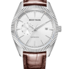 白色表盤,帶棒狀標(biāo)記。時、分、秒和日期顯示。這款奢華腕表的表盤 12 點鐘位置印有品牌標(biāo)識。