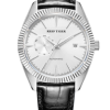白色表盤,帶棒狀標(biāo)記。時(shí)、分、秒和日期顯示。這款奢華腕表的表盤 12 點(diǎn)鐘位置印有品牌標(biāo)識。