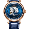 藍色表盤,帶阿拉伯數(shù)字標記。時、分、秒顯示。這款奢華腕表的表盤 12 點鐘位置印有品牌標識。