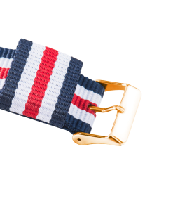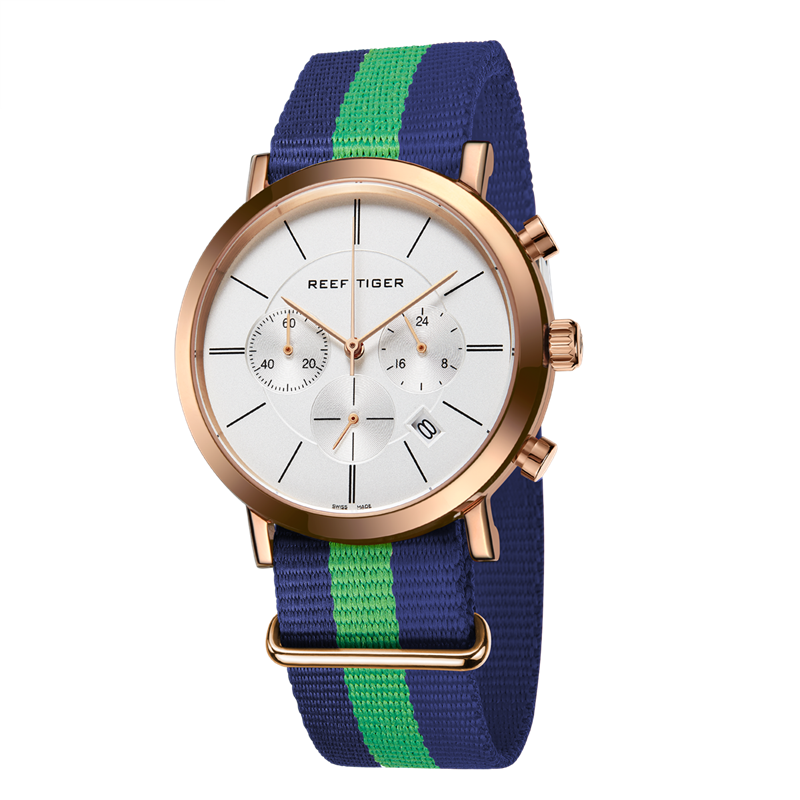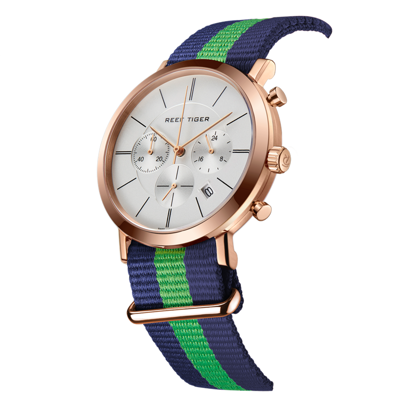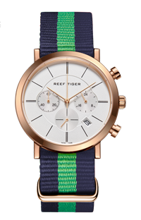 藍/綠色尼龍表帶,配以不銹鋼縫線和針扣,可在 Reef Tiger 專有表帶系統(tǒng)內互換。