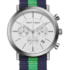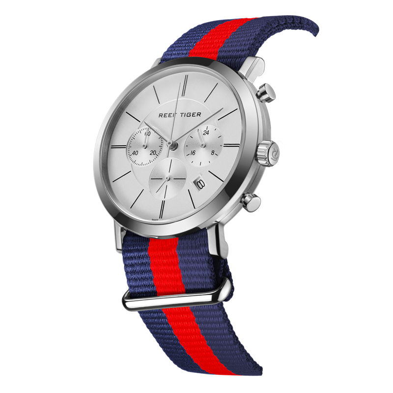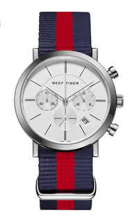 藍(lán)/紅色尼龍表帶,配有不銹鋼縫線和針扣,可在 Reef Tiger 專有表帶系統(tǒng)內(nèi)互換。