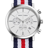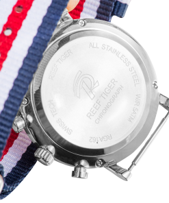 藍/白色尼龍表帶,配有不銹鋼縫線和針扣,可在 Reef Tiger 專有表帶系統(tǒng)內互換。