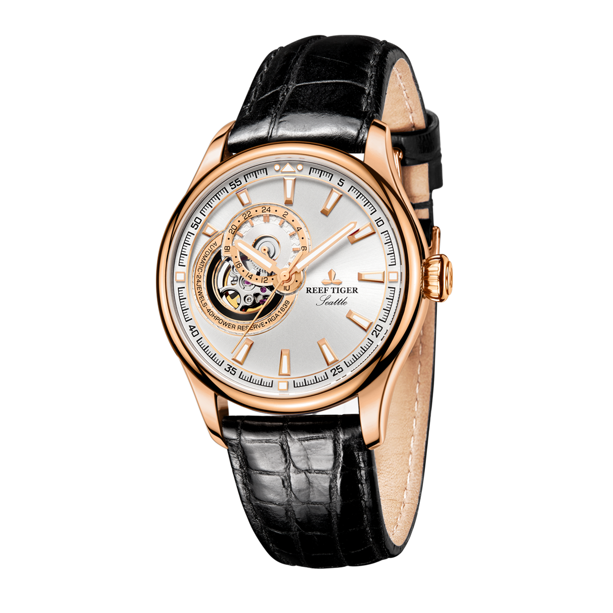 該款腕表表殼采用精鋼材質(zhì),局部鍍玫瑰金,表殼尺寸為44mm,延續(xù)了瑞夫泰格西雅圖腕表的簡(jiǎn)潔線條。表耳設(shè)計(jì)精致和諧,其弧度符合人體工學(xué)設(shè)計(jì),確保佩戴舒適。
