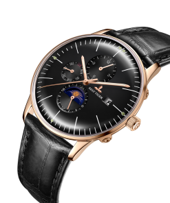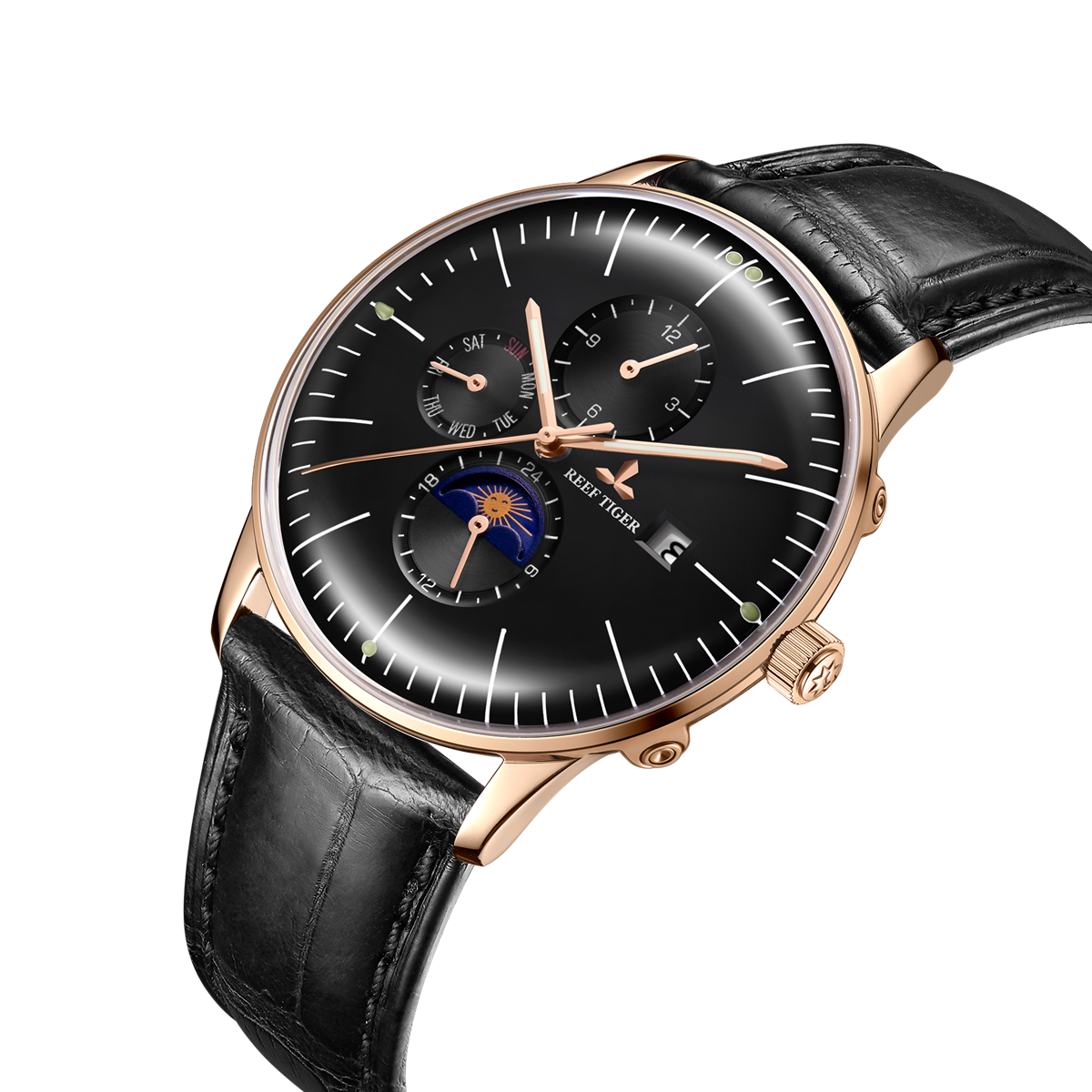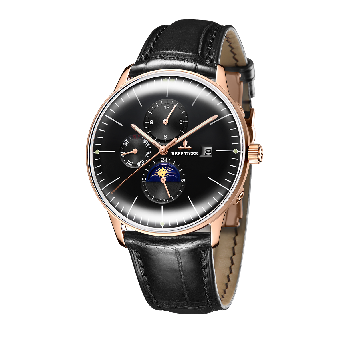 黑色表盤搭配玫瑰金色棒狀標記。時、分、秒、星期、日期和月相顯示。這款奢華腕表的表盤 3 點鐘位置印有品牌標識。