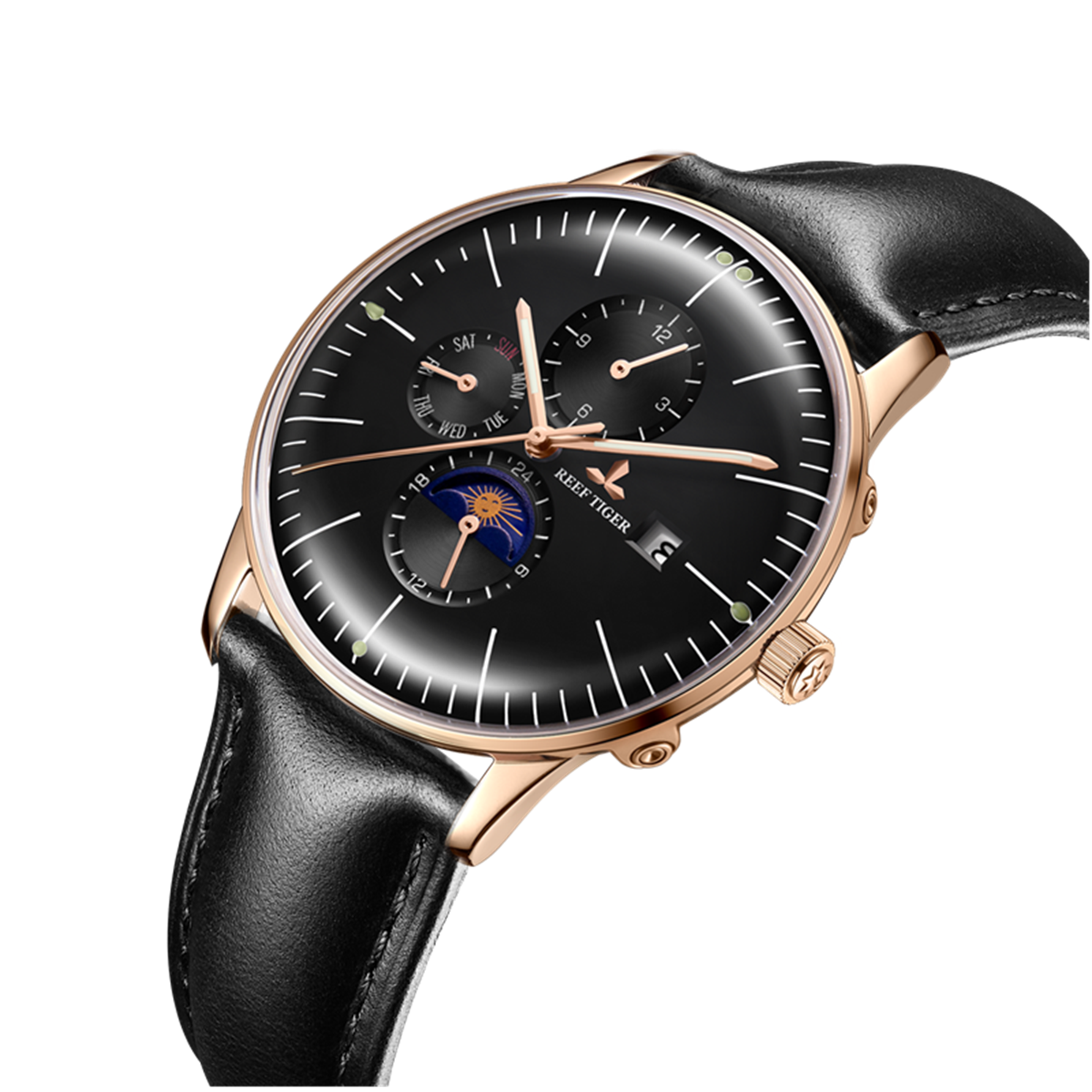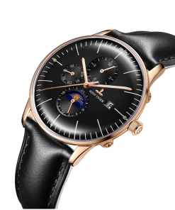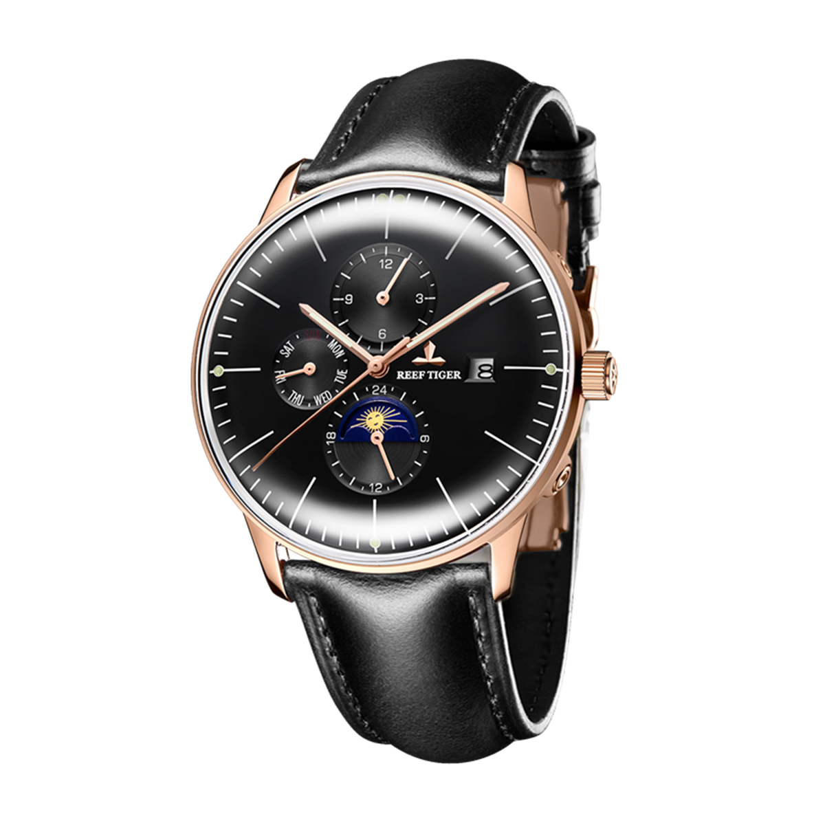 黑色表盤(pán)搭配玫瑰金色棒狀標(biāo)記。時(shí)、分、秒、星期、日期和月相顯示。這款奢華腕表的表盤(pán) 3 點(diǎn)鐘位置印有品牌標(biāo)識(shí)。