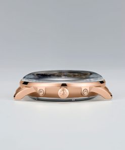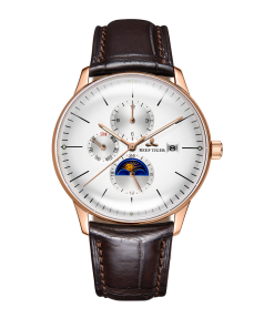 白色表盤,帶玫瑰金色棒狀標(biāo)記。時(shí)、分、秒、星期、日期和月相顯示。這款奢華腕表的表盤 3 點(diǎn)鐘位置印有品牌標(biāo)識。
