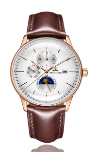 白色表盤,帶玫瑰金色棒狀標(biāo)記。時、分、秒、星期、日期和月相顯示。這款奢華腕表的表盤 3 點鐘位置印有品牌標(biāo)識。