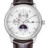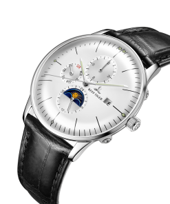 白色表盤,帶銀色棒狀標(biāo)記。時、分、秒、星期、日期和月相顯示。這款奢華腕表的表盤 3 點鐘位置印有品牌標(biāo)識。