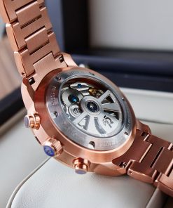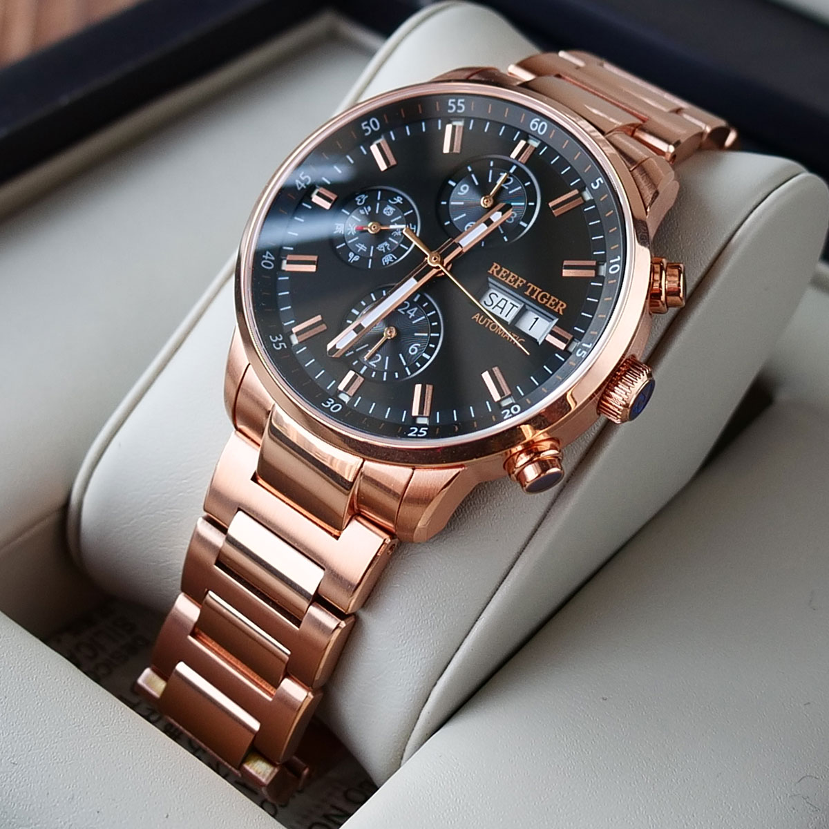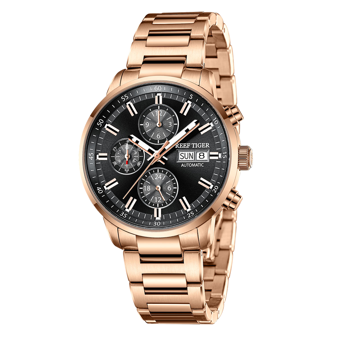 黑色表盤,帶銀色棒狀標(biāo)記。小時、分鐘、秒、星期、日期 這款奢華腕表的表盤 3 點鐘位置印有品牌標(biāo)識。