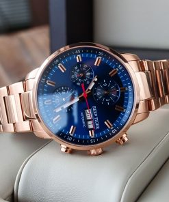 藍色表盤,帶銀色棒狀標(biāo)記。小時、分鐘、秒、星期、日期 這款奢華腕表的表盤 3 點鐘位置印有品牌標(biāo)識。