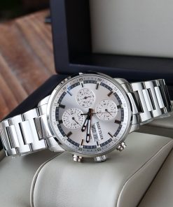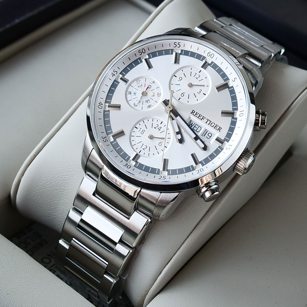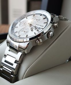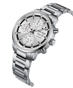 白色表盤,帶銀色棒狀標(biāo)記。小時、分鐘、秒、星期、日期 這款奢華腕表的表盤 3 點(diǎn)鐘位置印有品牌標(biāo)識。