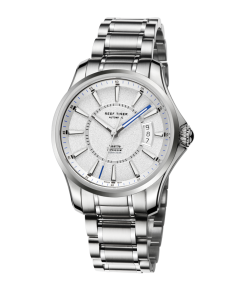 白色表盤帶棒狀標(biāo)記。時、分、秒和日期顯示。這款豪華手表的表盤 12 點鐘位置印有其標(biāo)志。