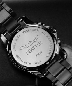 西雅圖太平洋計(jì)時(shí)腕表。耐用的不銹鋼鍍黑色 DLC,固定表圈也配有打造專業(yè)外觀的提案和演示。耐用的聚酯前后蓋,協(xié)調(diào)一致。