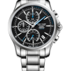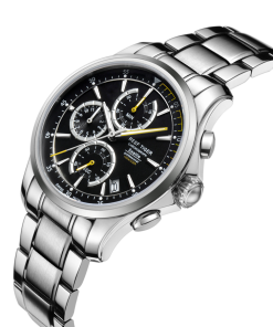 黑色表盤,帶條形標(biāo)記。計(jì)時(shí)碼表、小時(shí)、分鐘、秒和日期顯示。這款豪華腕表的表盤 3 點(diǎn)鐘位置印有其標(biāo)志。