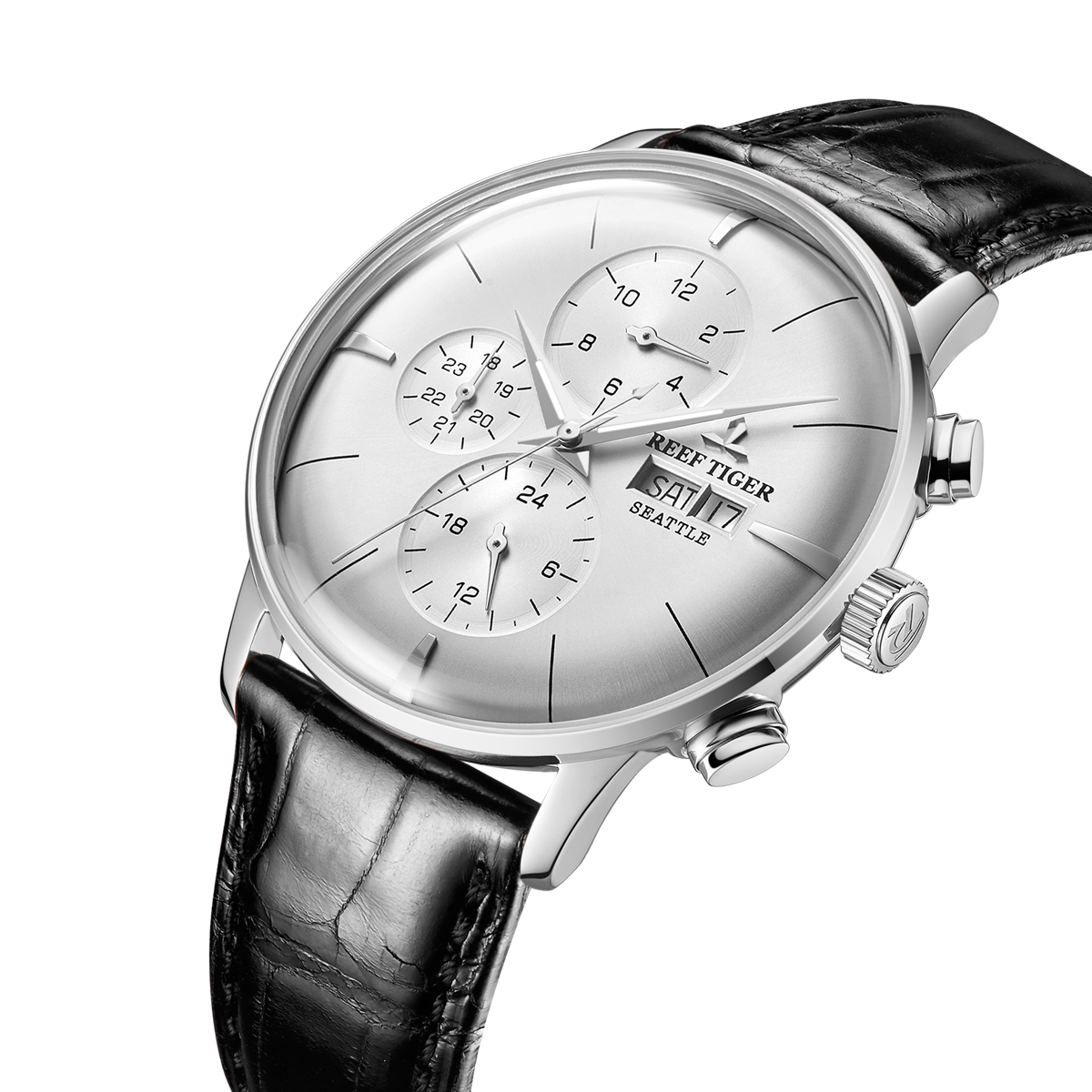 Reef Tiger Seattle Chief 腕表。耐用的鋼質(zhì)表圈還配有專(zhuān)業(yè)級(jí)的提案和演示。耐用的聚酯前后蓋,協(xié)調(diào)一致。