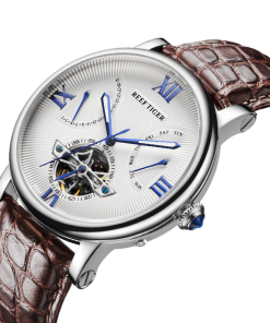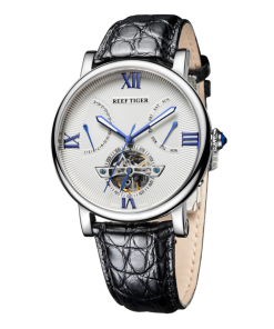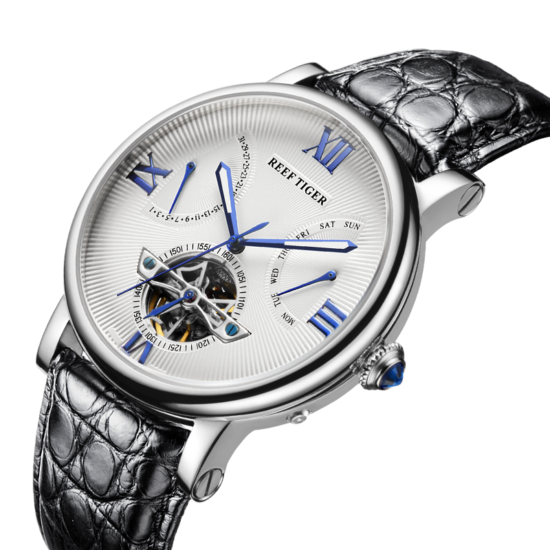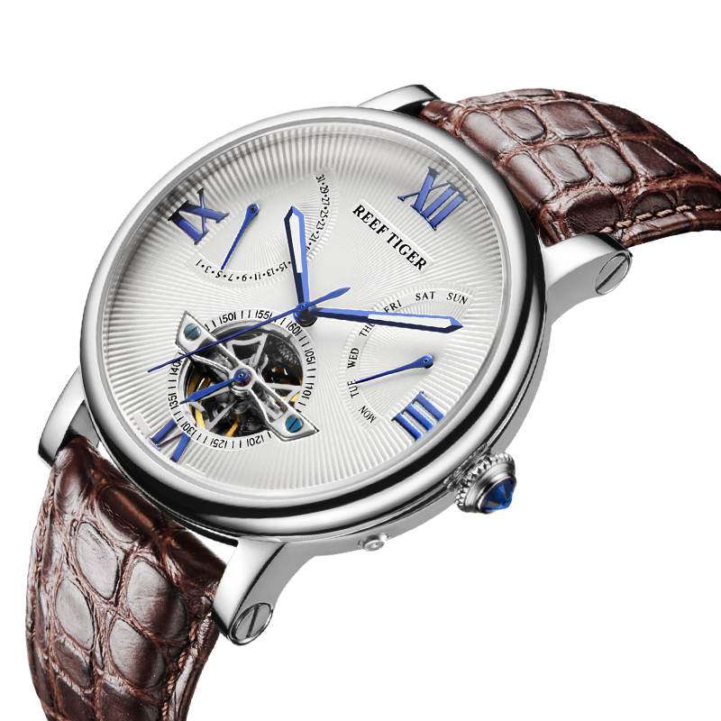 水波紋白色表盤(pán),羅馬數(shù)字時(shí)標(biāo),搭配飛輪、星期和日期顯示,映射成熟智慧。