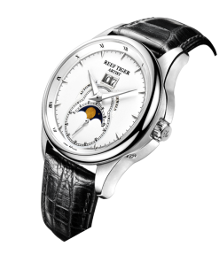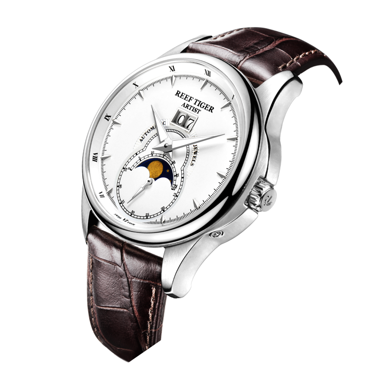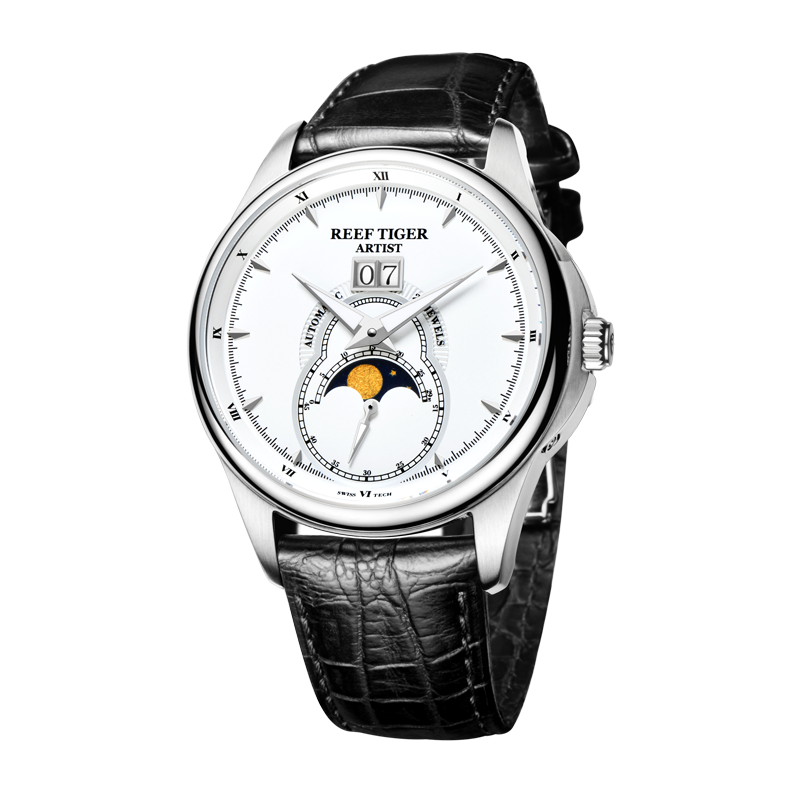 白色表盤,銀色調(diào)棒狀標(biāo)記。時、分、秒、雙日歷和月相顯示。這款奢華腕表在表盤 12 點鐘位置印有其標(biāo)志。