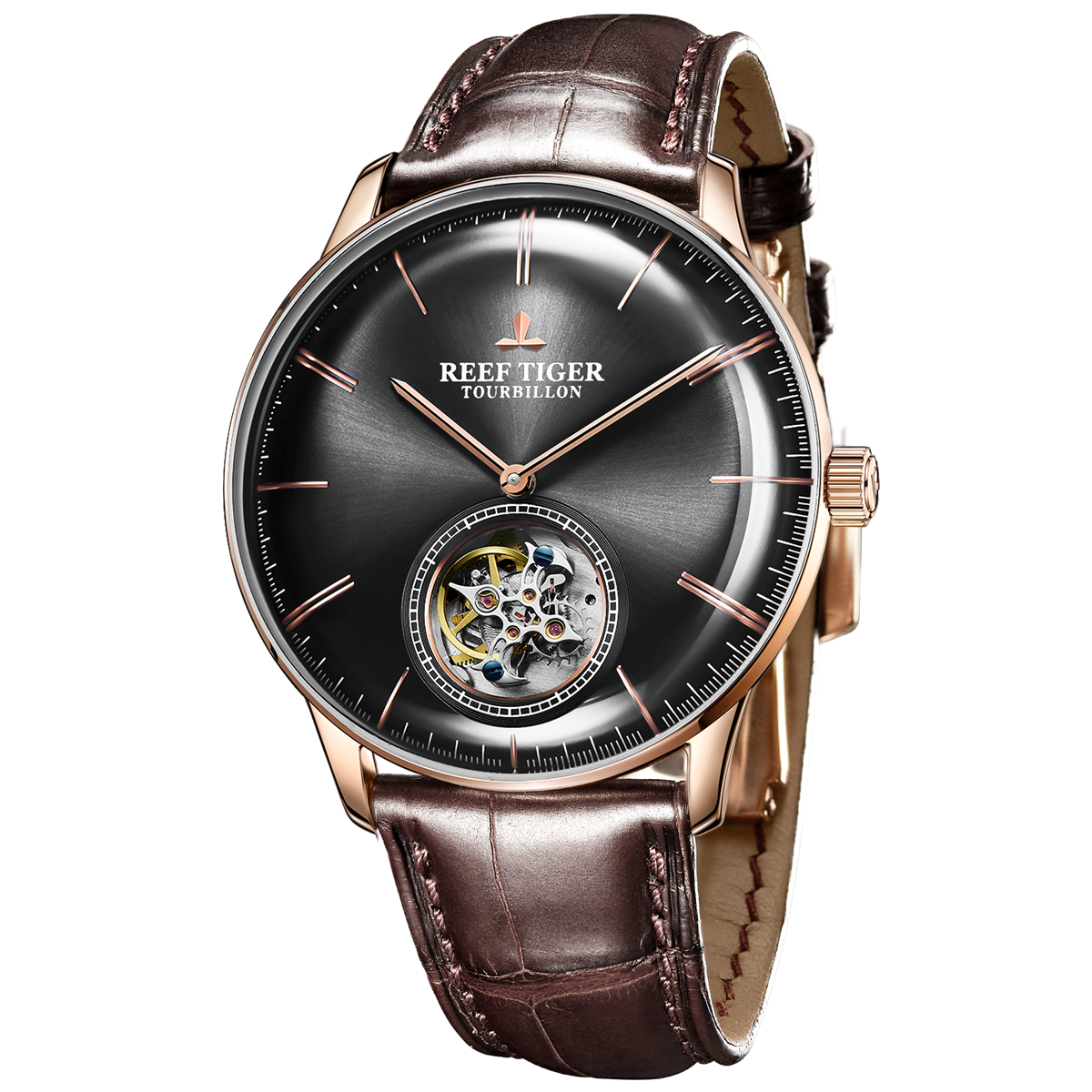 Reef Tiger Seattle 陀飛輪腕表。耐用的玫瑰金表圈,還配有玫瑰金表圈,打造專業(yè)的提案和演示。耐用的聚酯前后蓋,協(xié)調(diào)一致。