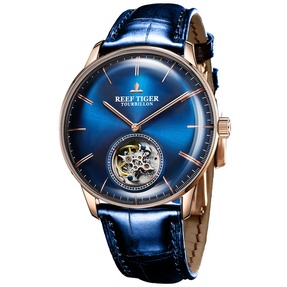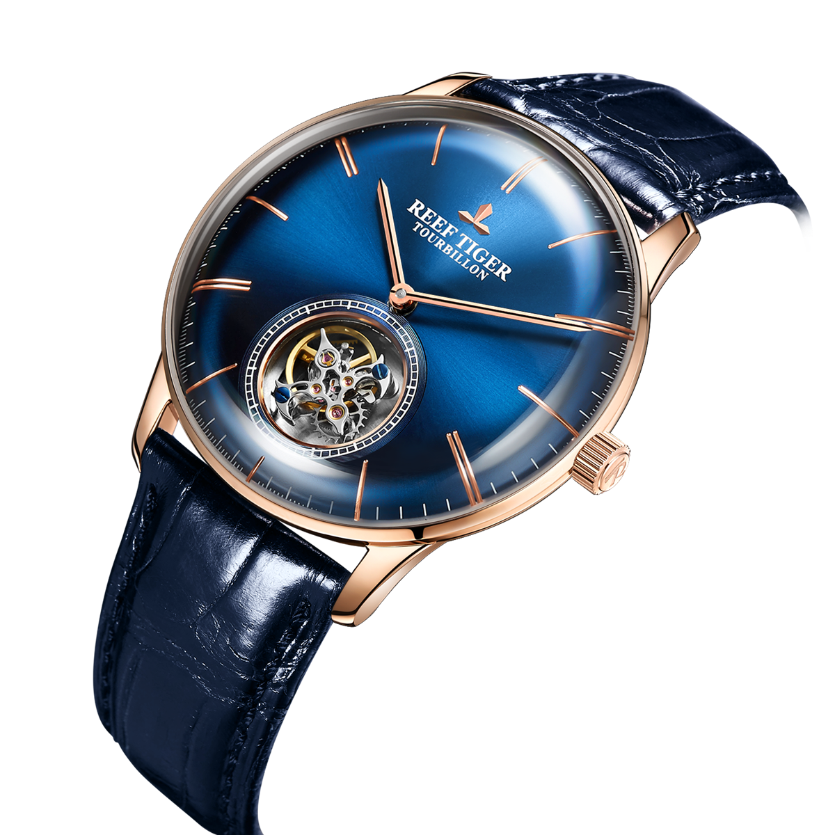 Reef Tiger Seattle 陀飛輪腕表。耐用的玫瑰金表圈,還配有玫瑰金表圈,打造專業(yè)的提案和演示。耐用的聚酯前后蓋,協(xié)調(diào)一致。