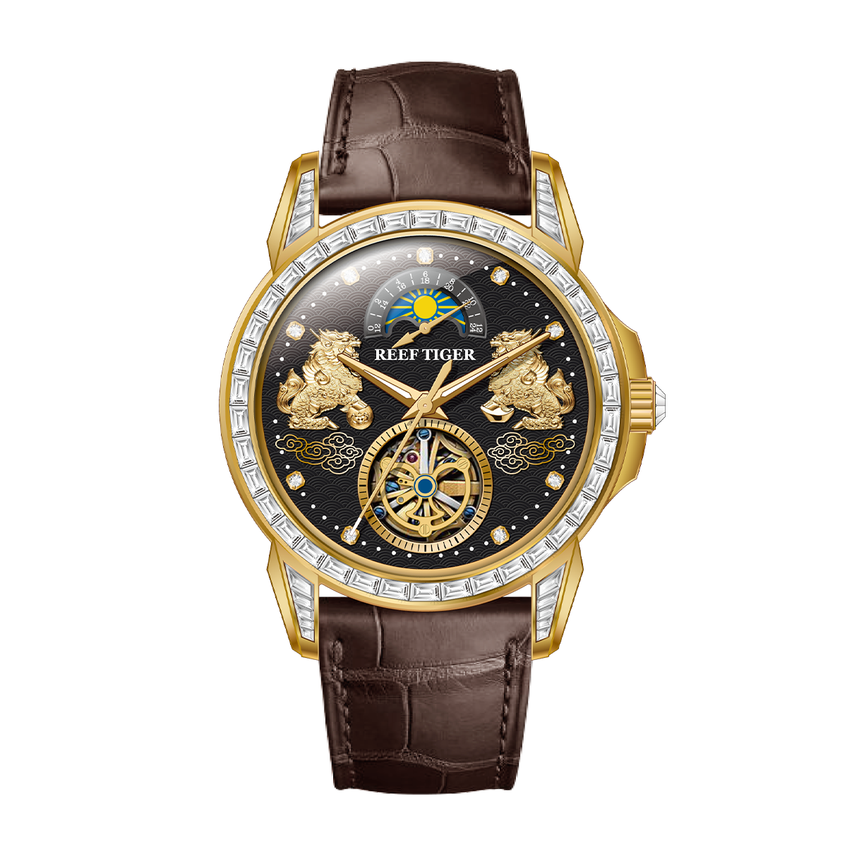 Reef Tiger 貔貅多功能男士鉆石皮革表帶自動手表 RGA1935-PBSD