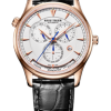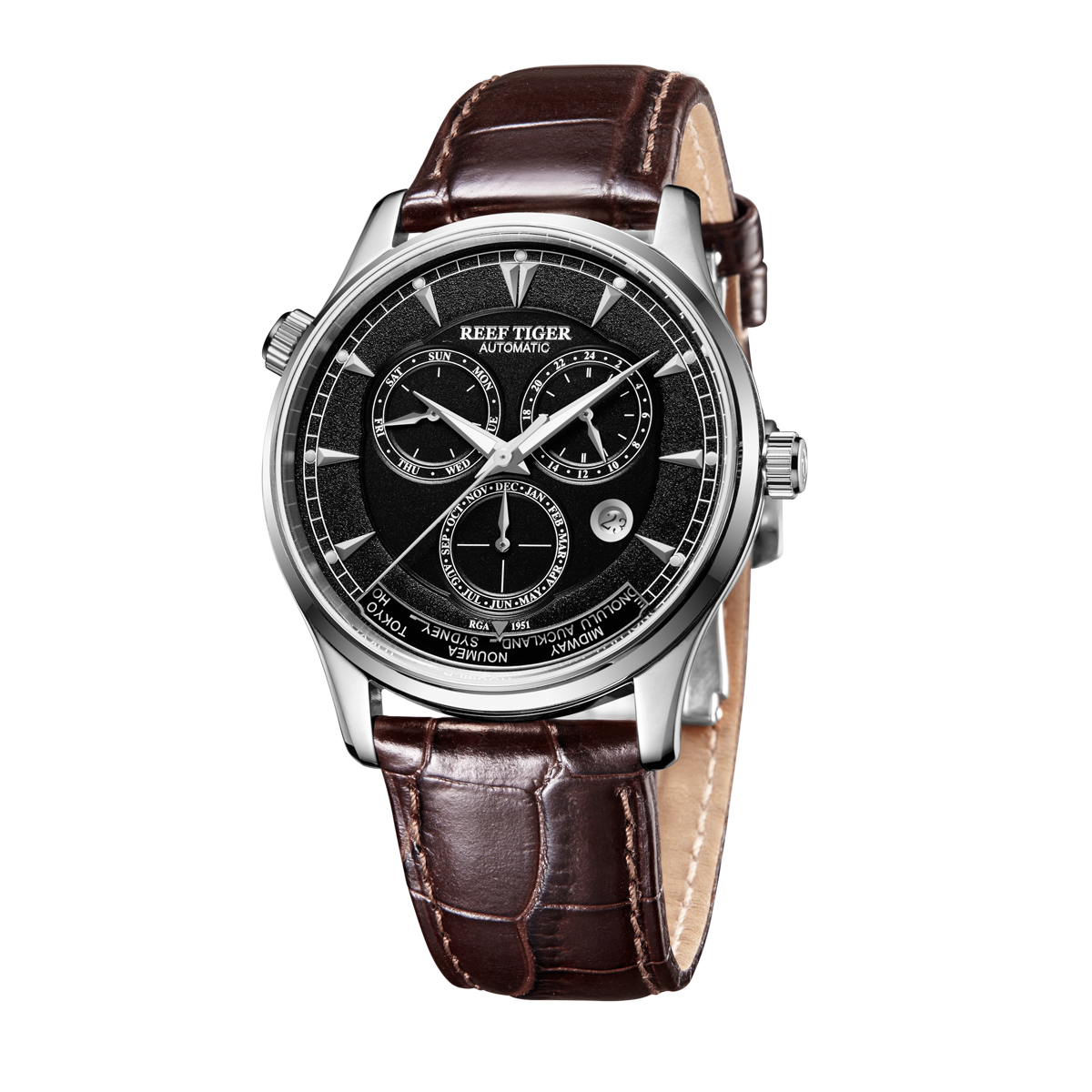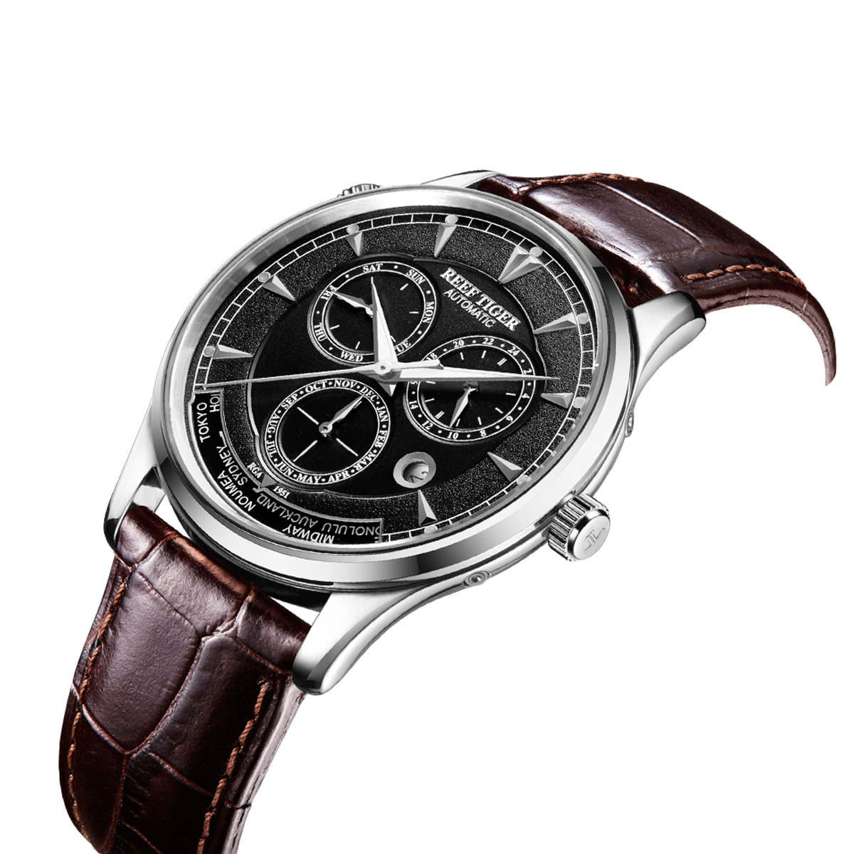 黑色表盤,帶棒狀標(biāo)記。日期指示器顯示在表盤的 10 點(diǎn)鐘位置。可以使用購買的腕表的免費(fèi)工具調(diào)整日期。當(dāng)腕表上弦時(shí),動(dòng)力儲(chǔ)存至少可達(dá)到 40 小時(shí)。RT7151 自動(dòng)機(jī)芯的動(dòng)力儲(chǔ)存約為 48 小時(shí)。24 小時(shí)指示,指針顯示在 2 點(diǎn)鐘位置。您可以按下表殼上 2:00 處的按鈕進(jìn)行調(diào)整。但請(qǐng)不要在晚上 8:30 至次日凌晨 3:30 之間調(diào)整,因?yàn)樵诖似陂g星期功能正在更改。月份指示子表盤顯示在 6 點(diǎn)鐘位置。此外,此子表盤下方還顯示世界時(shí)間指示器。Reef Tiger Geographer 系列手表提供兩種款式可供選擇,包括不銹鋼款和玫瑰金款。